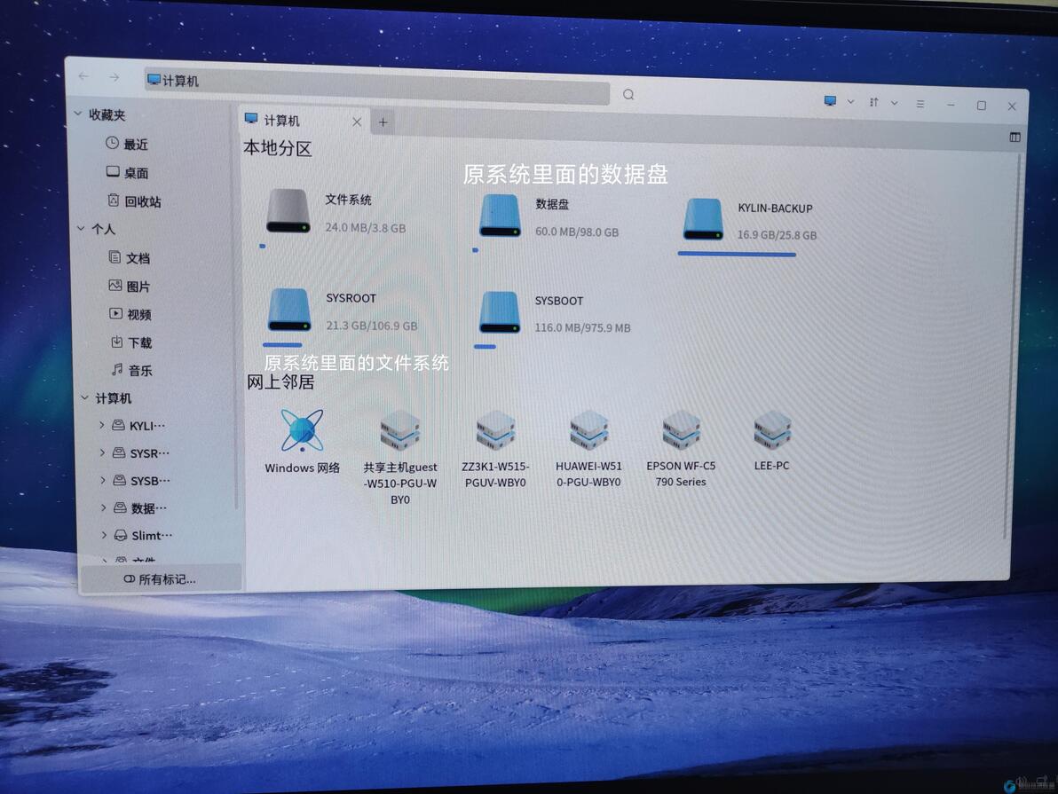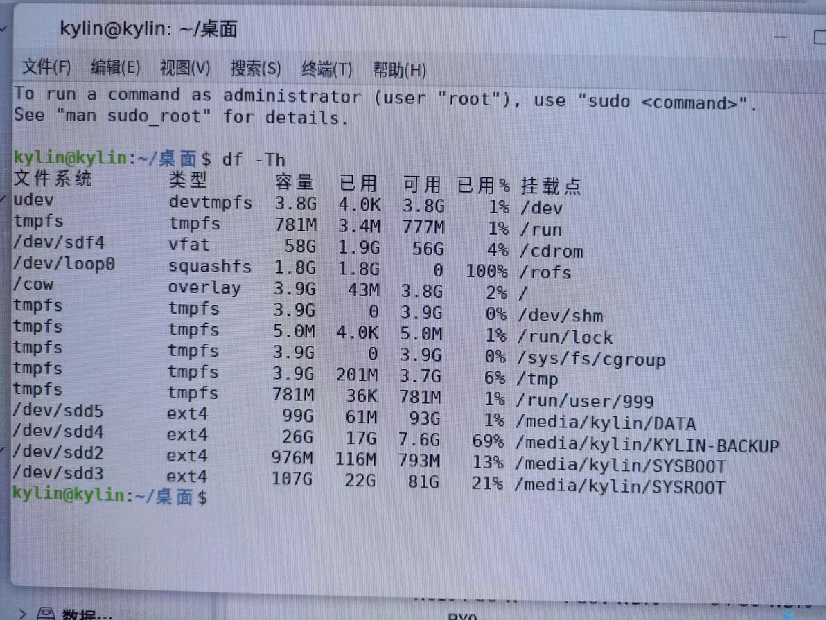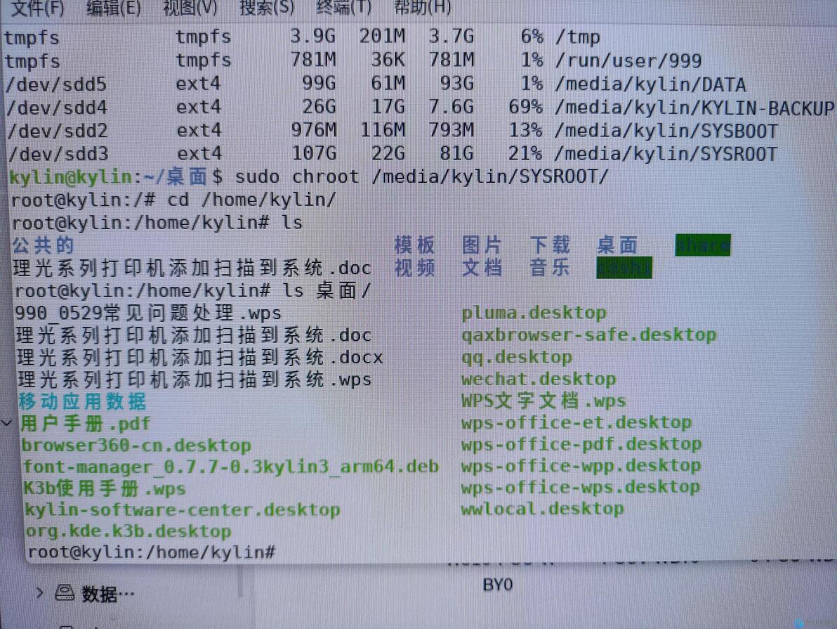 然后就可以在里面将/home/kylin/桌面下的各种资料cp 到根目录。