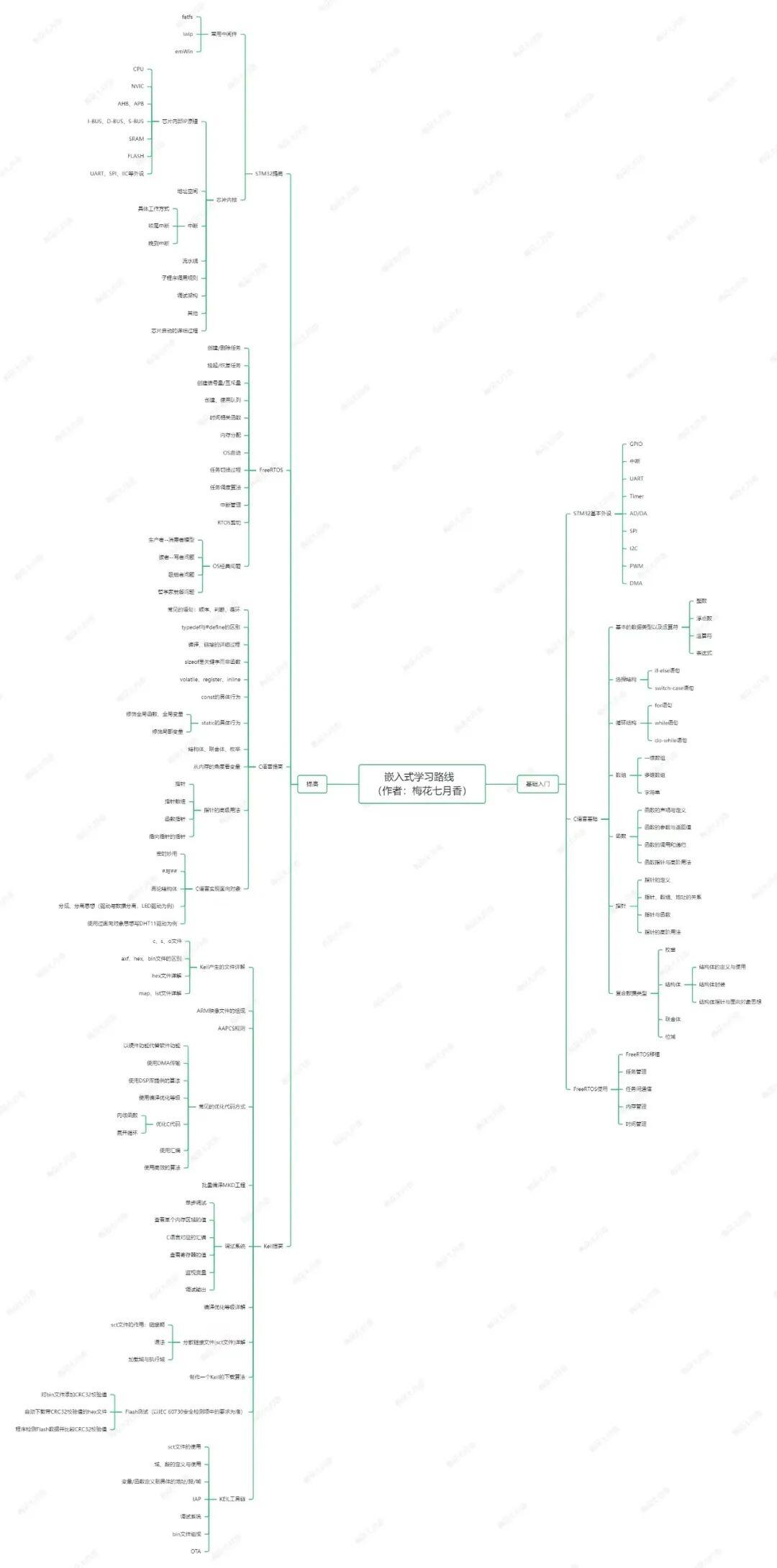 一般嵌入式学习(以stm32为例)中,主要集中在四个方面:C语言、STM32(外设及内核)、RTOS、工具链。接下来将详细的阐述下,上述四个方面该如何学习,如果是本身没什么基础的同学,可以直接按照博主说的学习,博主本人就是这么学习的。