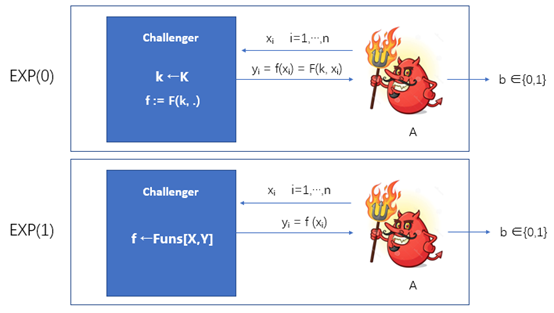 我们仍然定义一个安全模型。在 PRF 的安全模型中,同样考虑两个挑战者,每个挑战者都控制着一个函数 f,只不过不同的挑战者选择f时候的方法不同: