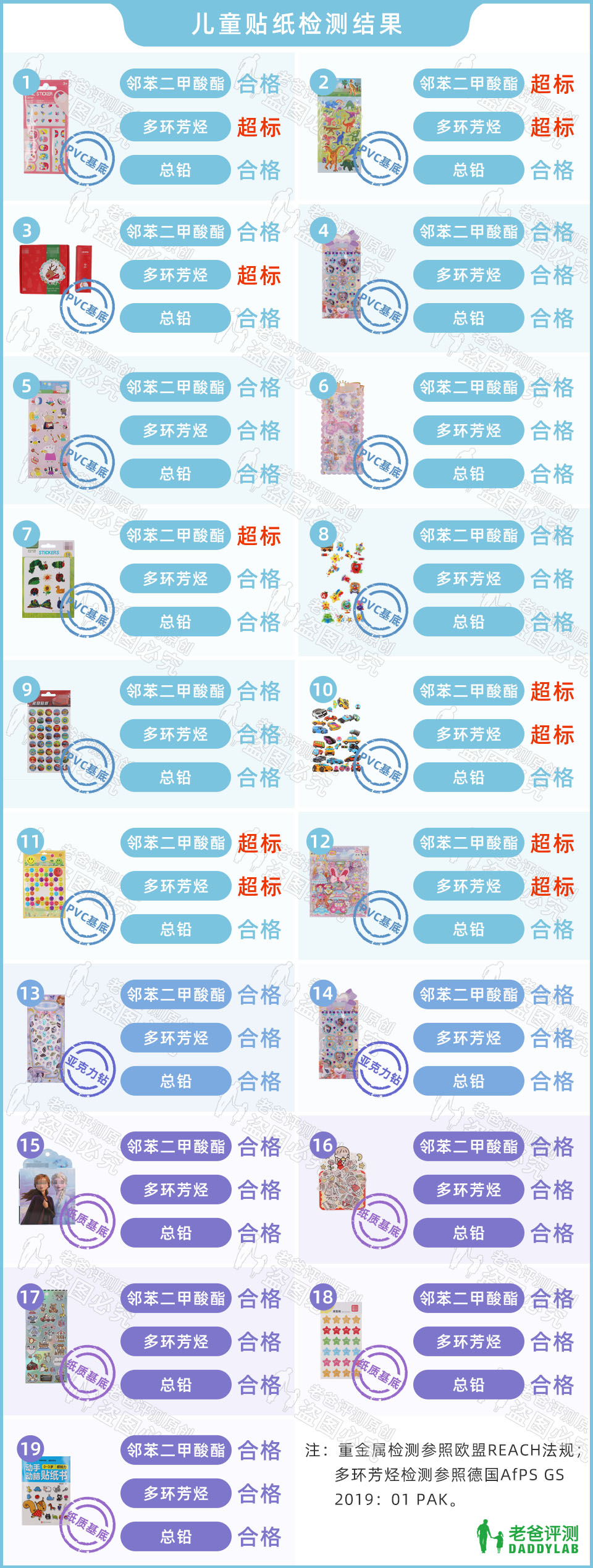 19 款儿童贴纸的实际检测结果如下: