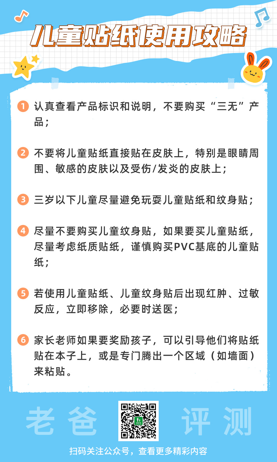 我们的建议是,尽量不要让孩子将贴纸贴在自己身上,如果一定要使用,购买严格执行国家标准的、产品信息明确的产品。并且接触后一定要及时洗手,不要直接接触口鼻。