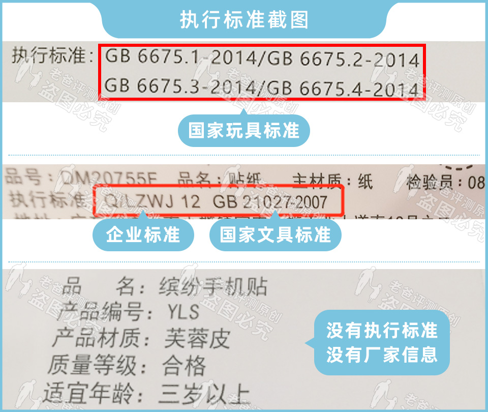 拿到样品比对发现,这些儿童贴纸、纹身贴的执行标准各不相同,有的执行国家文具标准、玩具标准,有的执行企业标准,甚至还有“三无”产品。