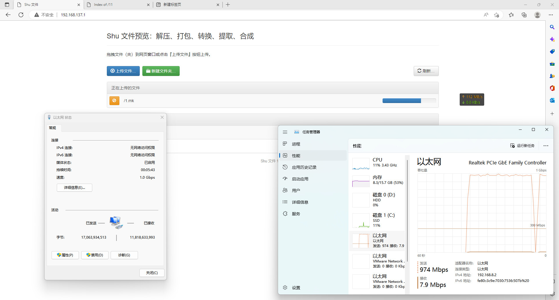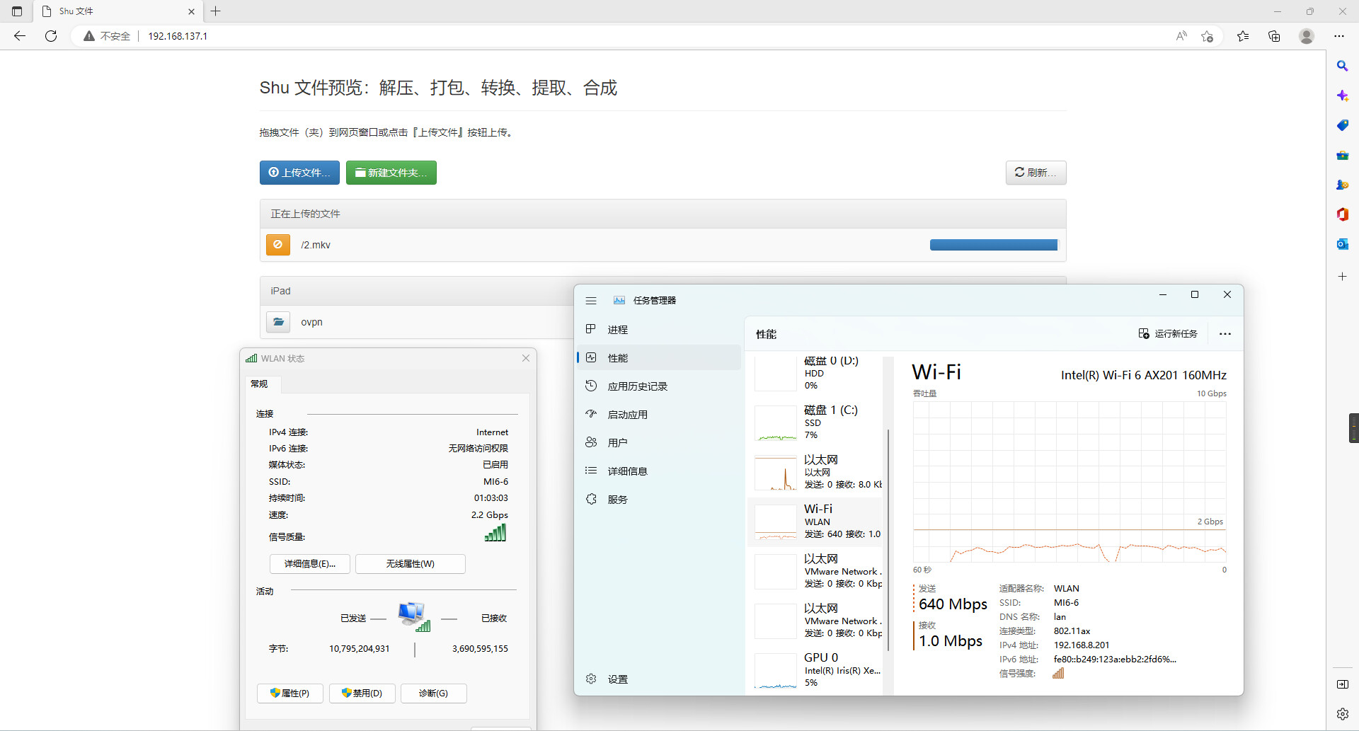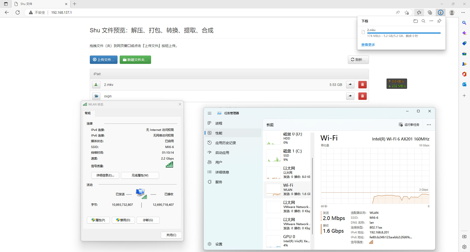 在iPad上的文件上传和下载服务,上传依旧在1G上下的速度
