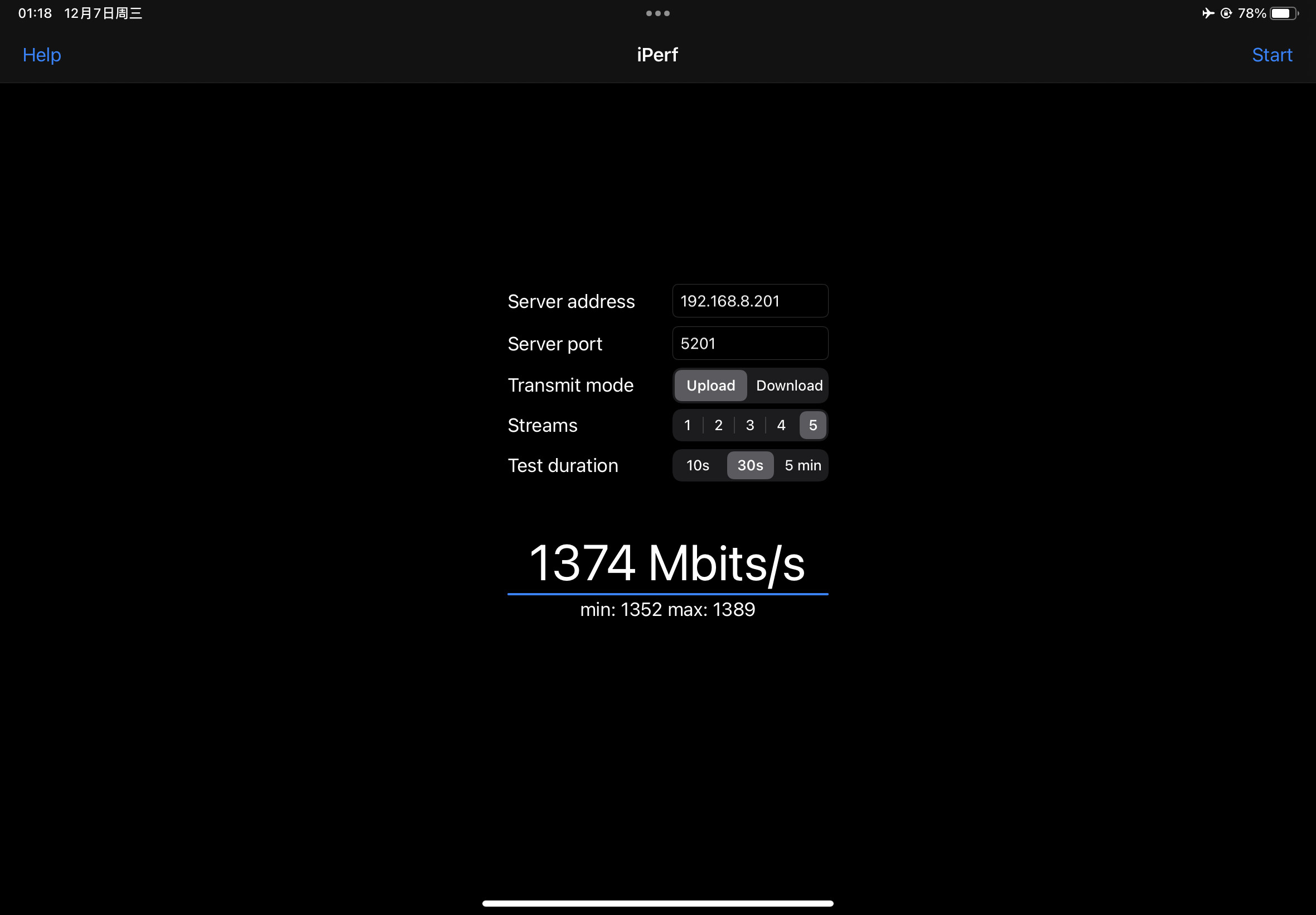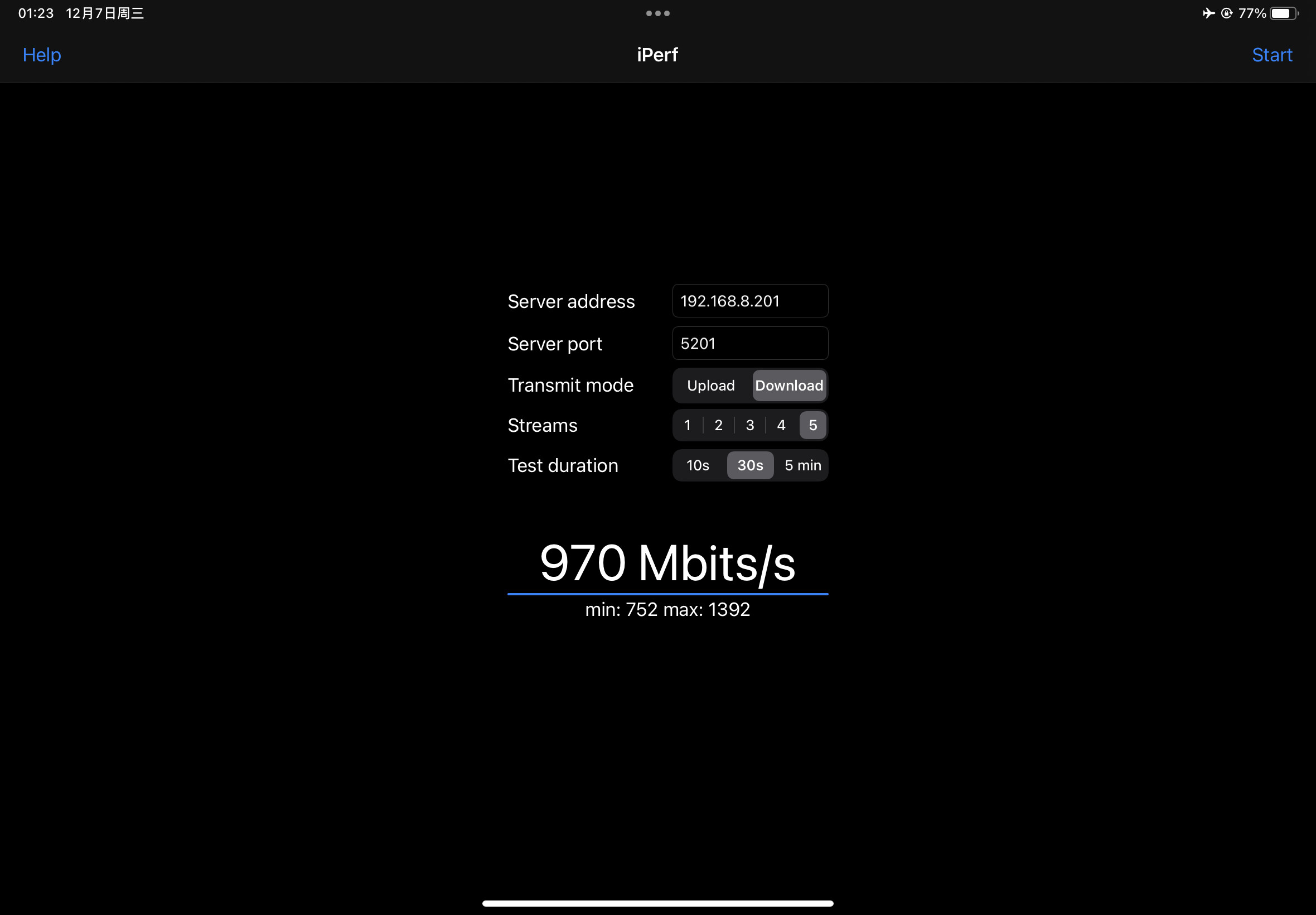 来自iPad Air5的截图,Air5有线连接2.5G网口作为iperf3的客户端,笔记本连接无线作为服务器端