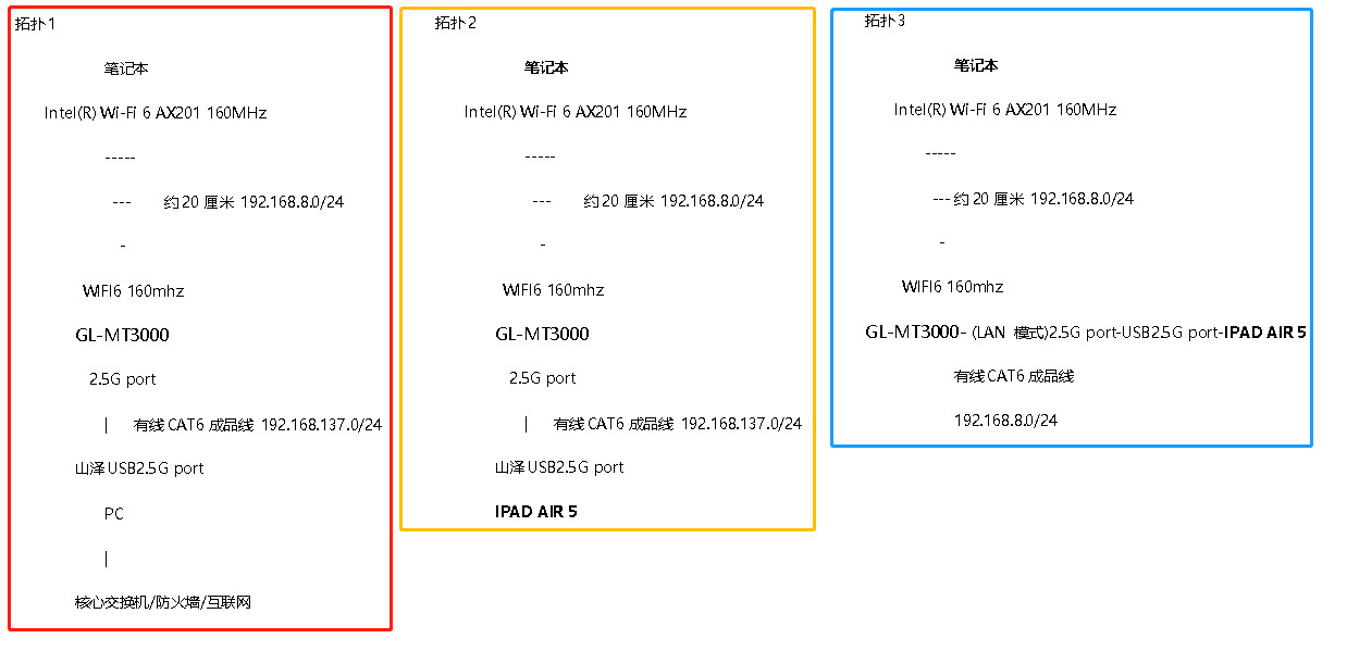 分别在以下三种网络拓扑中测试路由器的基础有线和无线功能