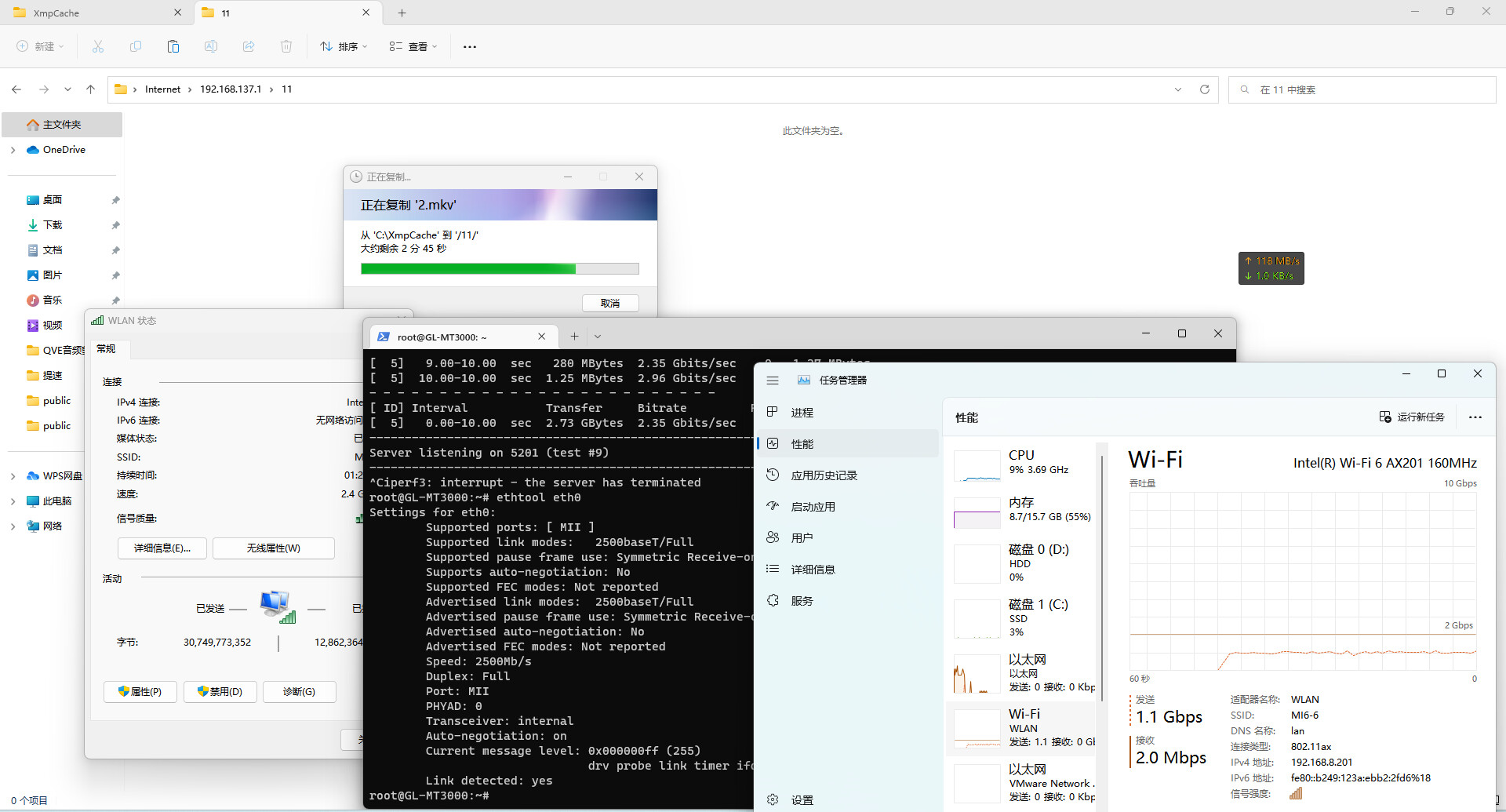 通过无线上传到FTP,大约1G每秒,WAN口协商速率是2.5G