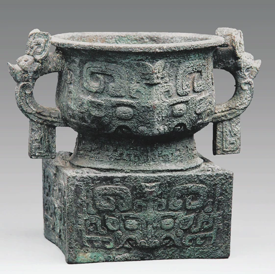 利簋是圆形双耳方座簋,为敞口,这是西周初期的一种典型造型。利簋上饰纹饰,大体分为三种,即云雷纹、兽面纹、夔龙纹。