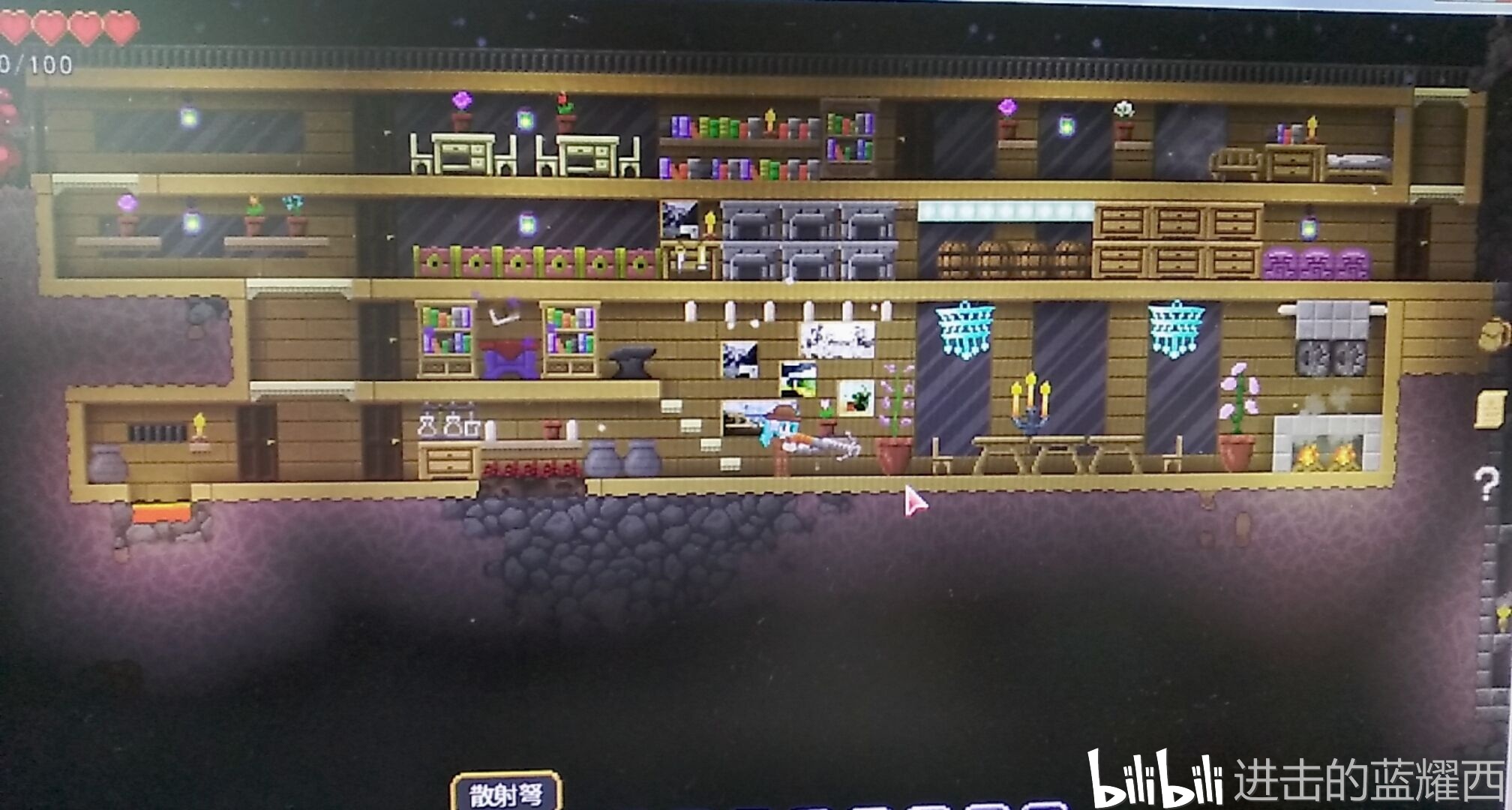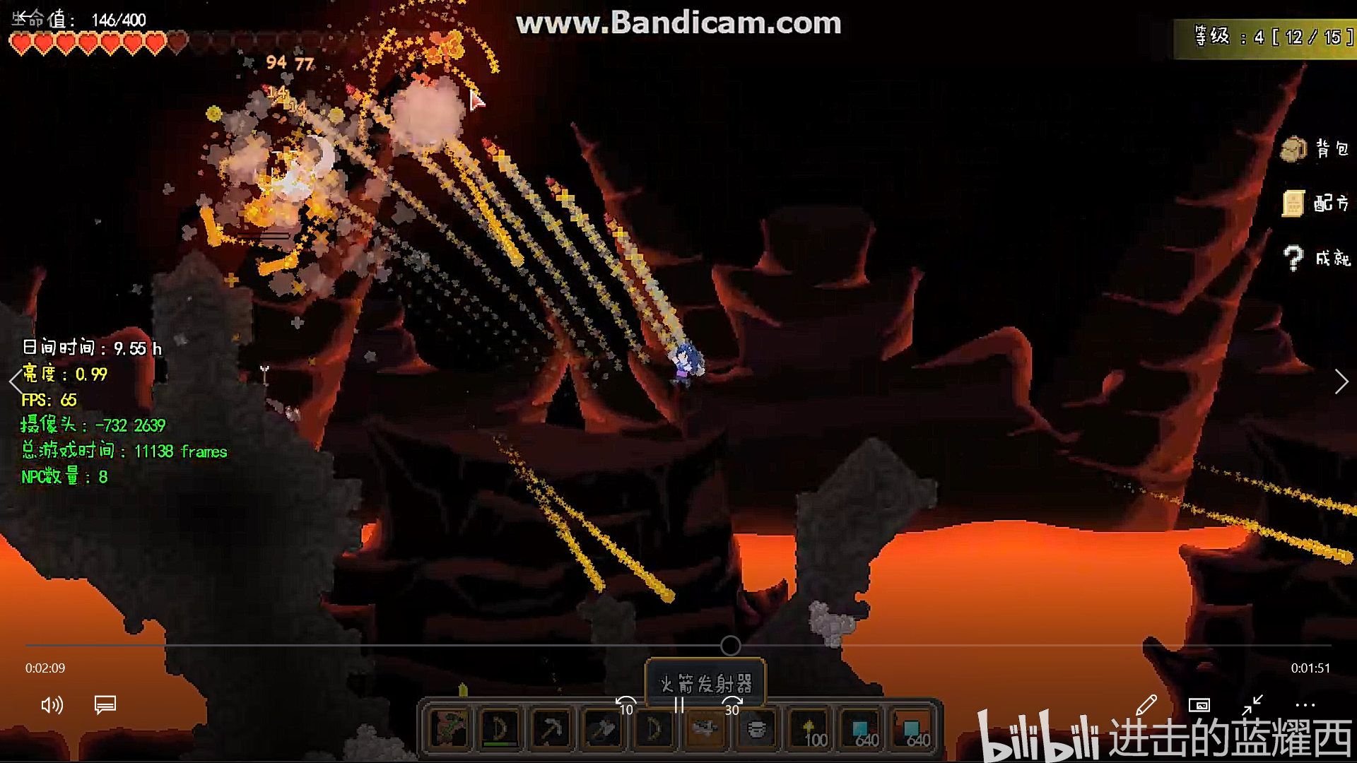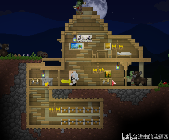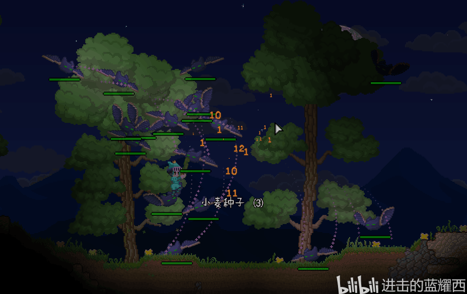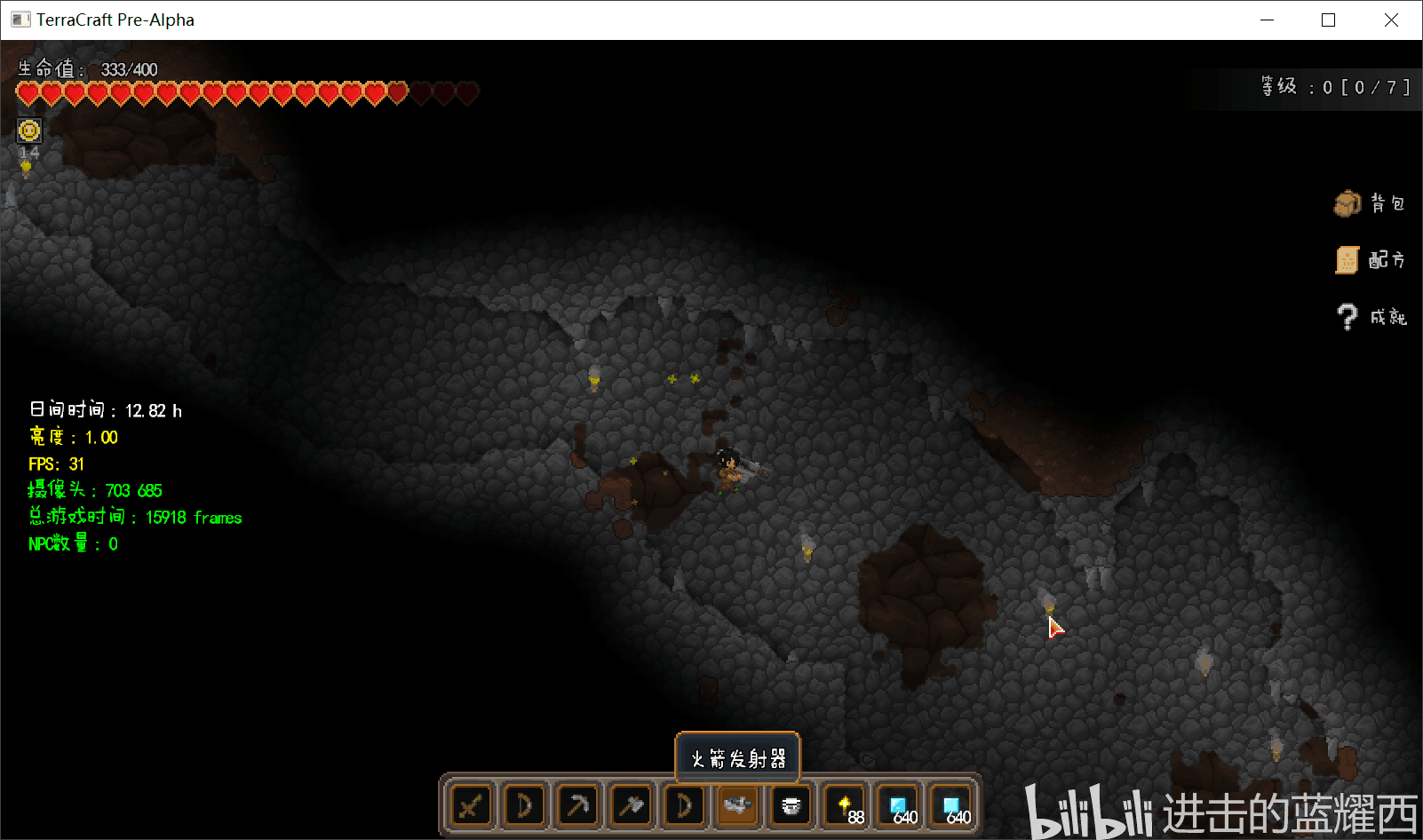 什么?你问泰拉世界第一个预告片中出现的自带制导系统的向导精灵宠物(图中在玩家头上飞的拿霰弹枪的那个)在发布版本怎么不见了?因为后来UP把代码重构成为客户端服务端框架,只能将这个精灵放在了未来的更新再进行公布。塔防系统也推迟到了未来再公布。